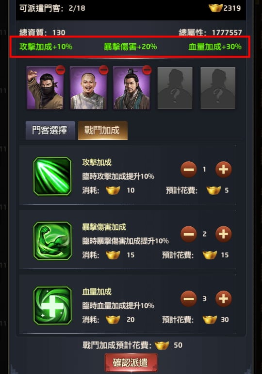 差異之處在於「臨時屬性加成」需在派遣前就先在「戰鬥加成」這個界面購買,也不像衙門可以用「小綠燈」買,都得花元寶。