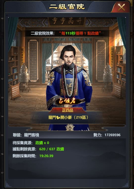 一般像「翰林院」來說,你不會去坐那些只剩幾分鐘的位置,因為賺不到多少政績(但有白目喜歡故意這樣做,害別人得冷卻1小時)。