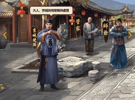 《叫我官老爺》中的「京城系統」界面,要從府宅內的「京城使節」這進入,若有相關消息,使節頭上也會出現文字提醒。