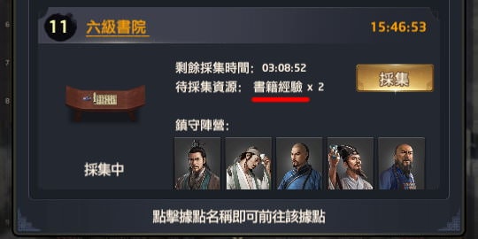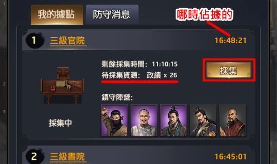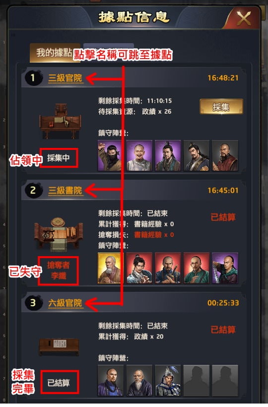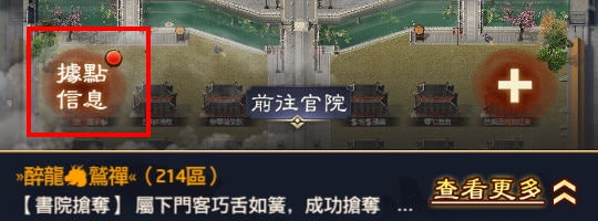 另外點擊據點名稱(如三級書院、六級官院)可跳至該據點界面,這個功能大概是當你據點被搶走,想搶回來時可用。