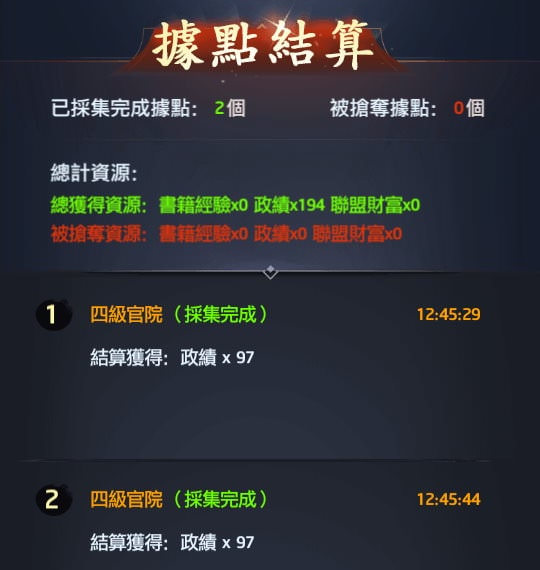 若你忘了採集資源或沒空,但據點也沒被別人佔走,據點時間到後(資源被採集完畢)之後,也會跳出「據點結算」訊息來通知你。