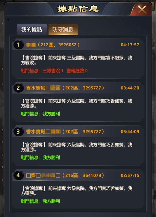 只要有人搶奪你的府邸、書院、官院、商院,不管成功失敗,都會出現在「防守消息」這邊。