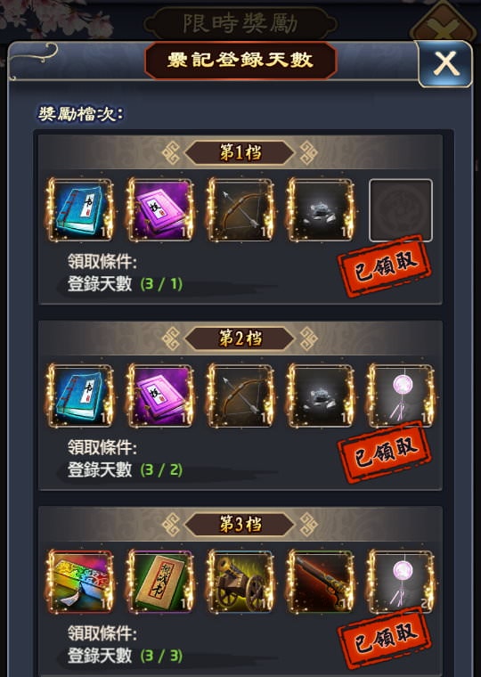 | 3, 限時獎勵:衙門衝榜時期「限時獎勵」中的「累計登入次數」會送挑戰書、火槍、大砲。 |