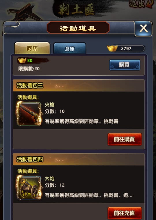 | 2, 活動:「剿土匪」用積分兌換,得花元寶買「弓箭」賺積分會比較快,也是沒充值玩家的可行辦法。 |