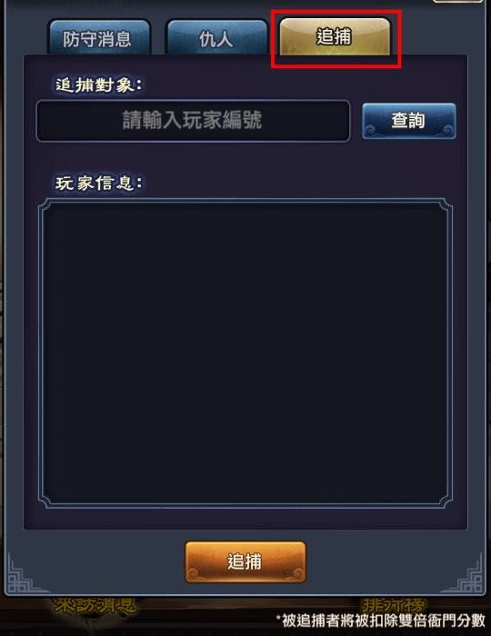 在 來訪消息 > 追捕 這邊,輸入玩家編號,可直接追捕對方,而且被追捕者會被扣兩倍的分數。