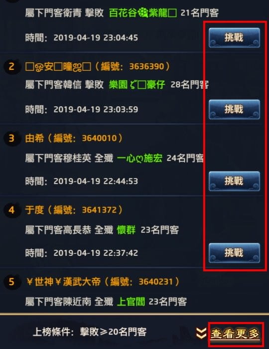 方法2, 查看更多,可以從「上榜」的玩家中挑選一名點「挑戰」,消耗挑戰書打對方。挑戰上榜者無次數限制。
