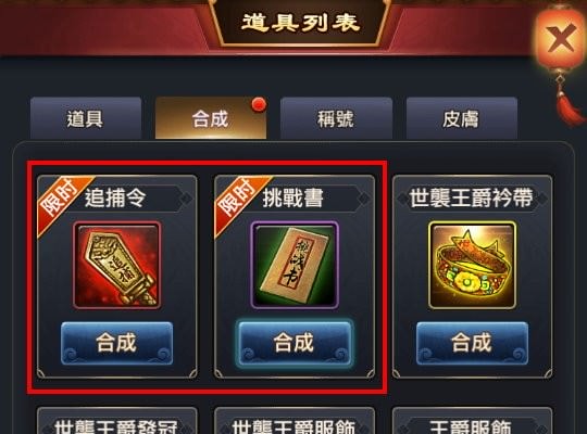 在「衙門衝榜」期間,「道具」裡的「合成」會多出「追捕令」、「挑戰書」的合成。