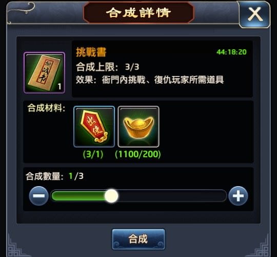「挑戰書」需要200元寶+1個出使令,1天最多可合成3個,若衝榜有2天最多可合成6個、3天最多可9個。