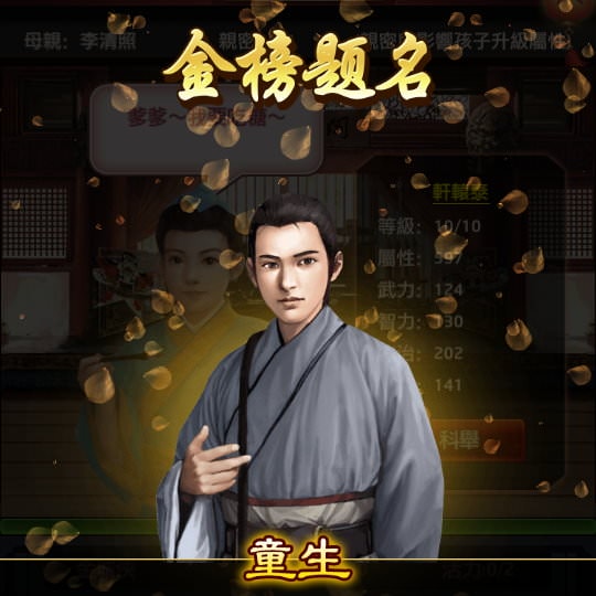 一開始紅顏親密度低,生出的小孩科舉後都是「童生」。