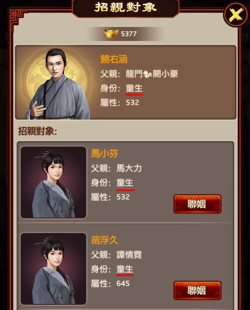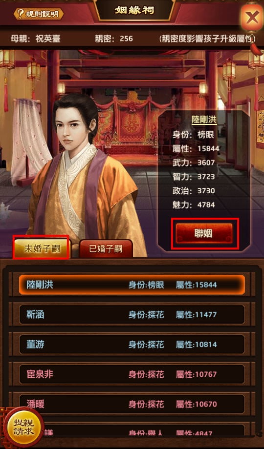 小孩「科舉」後,就可以娶嫁,點「媒婆」後的「未婚子嗣」界面,可以看到所有還沒結婚的孩子,挑選某個孩子後再點「聯姻」,即可娶嫁。