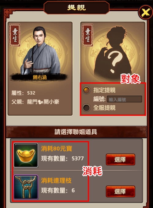 提親「對象」的部份,若你沒有特別要跟誰聯姻(通常是尚未加入聯盟,或你要解主線任務,想在「非勢力衝榜」時期聯姻),可選「全服提親」,把小孩丟上去;別的玩家在點「招親」時看到你的小孩可能就會選走。