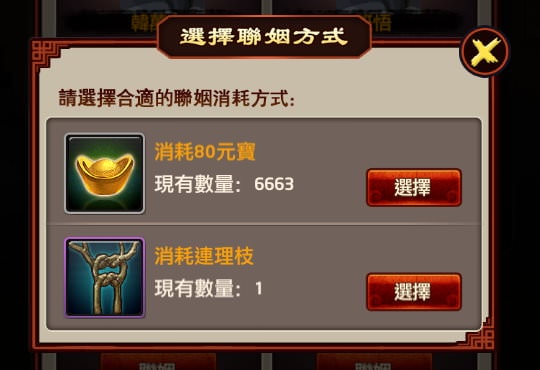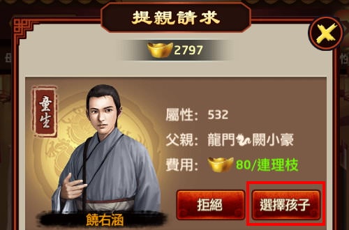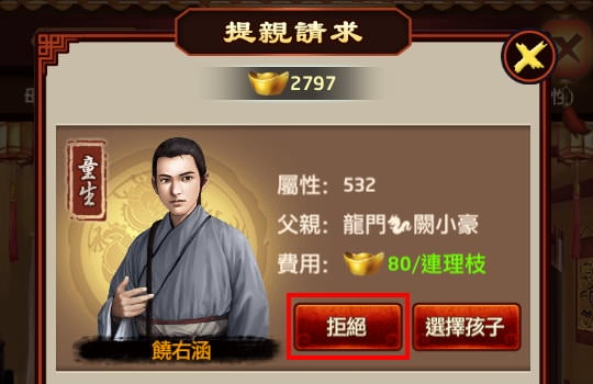 接著可以看到提親請求,不要就直接「拒絕」,元寶會退給玩家,若要就選擇孩子,接著選擇看是要消耗元寶還是道具。