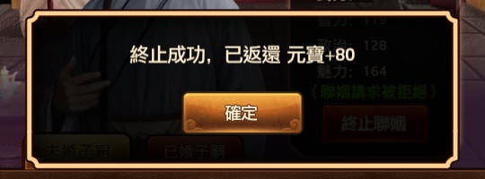 像童生要80元寶,自行按下「終止聯姻」只會還你64元寶(80%),進士要450元寶,只會退還你360元寶。