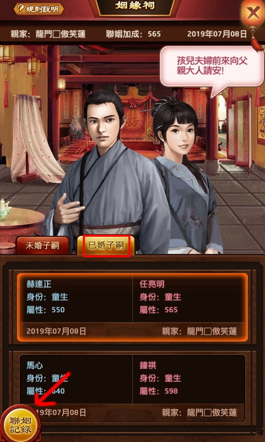 「已婚子嗣」這邊能看到所有結婚的紀錄,就很簡潔的資訊,左下角有「聯姻紀錄」。
