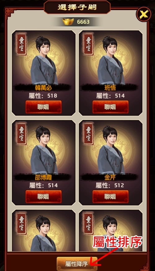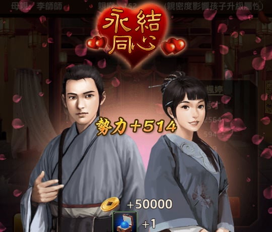 一開始子嗣屬性都很低,加成效果不明顯,但後期子嗣屬性能拼到百萬以上,娶嫁一個勢力就瞬間增加百萬以上,在「勢力衝榜」時期很有幫助。