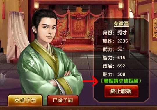 | 狀況A:對方馬上選擇子嗣配給你,你可以領限時獎勵,聯姻1次40元寶(勢力衝榜時期才有),可以領成就獎勵(銀兩),可以解「主線任務」等等。 |