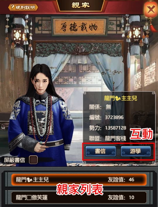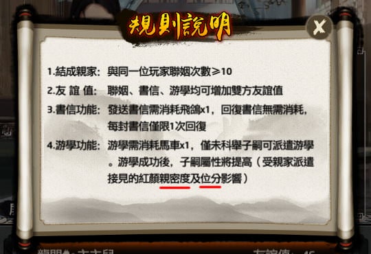建議新服剛開不用急著聯姻、結親家與遊學,除非親家是高充值VIP,紅顏親密度已經上千或破萬,否則效果不大。
