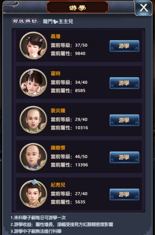 | 2, 遊學效果是看對方接見紅顏的「親密度」與「位分」。 |