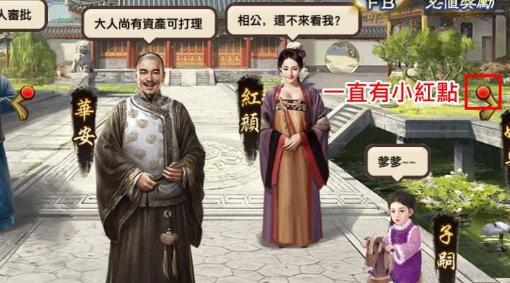 - 原本為「管家」的畫面在府宅左側,一般人通常不會滑過去看,若有送子嗣去親家遊學,親家可能會因為沒注意到而沒有回應,得先告知對方一聲再送去遊學比較好。改版後,管家位置已移到媒婆右側,若有新互動會有小紅點提醒。
