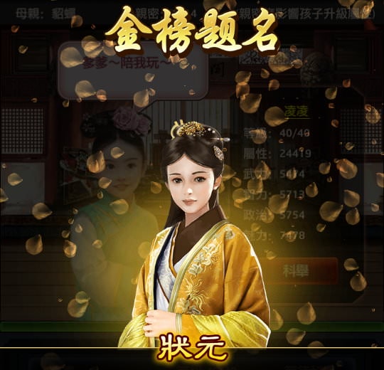 子嗣屬性只要破2萬就會是狀元,至於要衝到多高就看個人,可以在「等待科舉」狀態放著一直靠遊學來添加屬性。