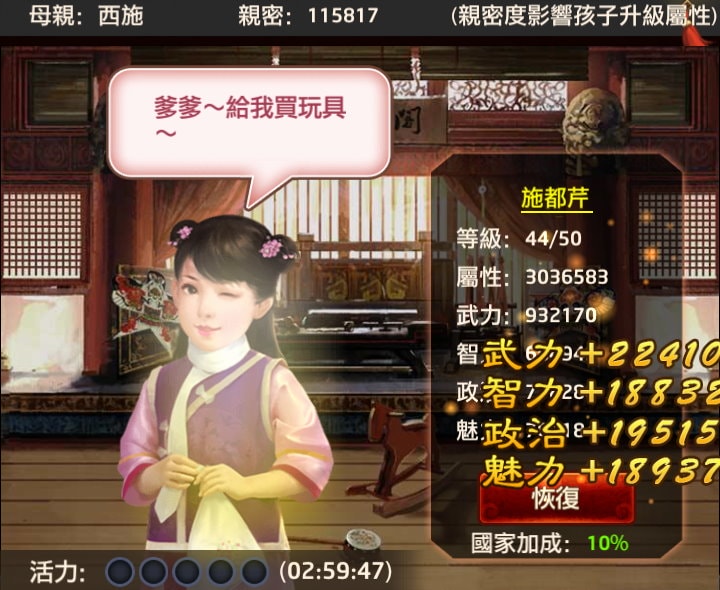 前面有提到生子嗣跟加成有關,其中母親位份達「傾國傾城」(+21%)、國家加成(+10%)這是每個玩家即使不充值也都能達成的,子嗣的資質設為「神童」,忽略「紅顏總位份」與「基本屬性」的部份,以這些為基本條件,