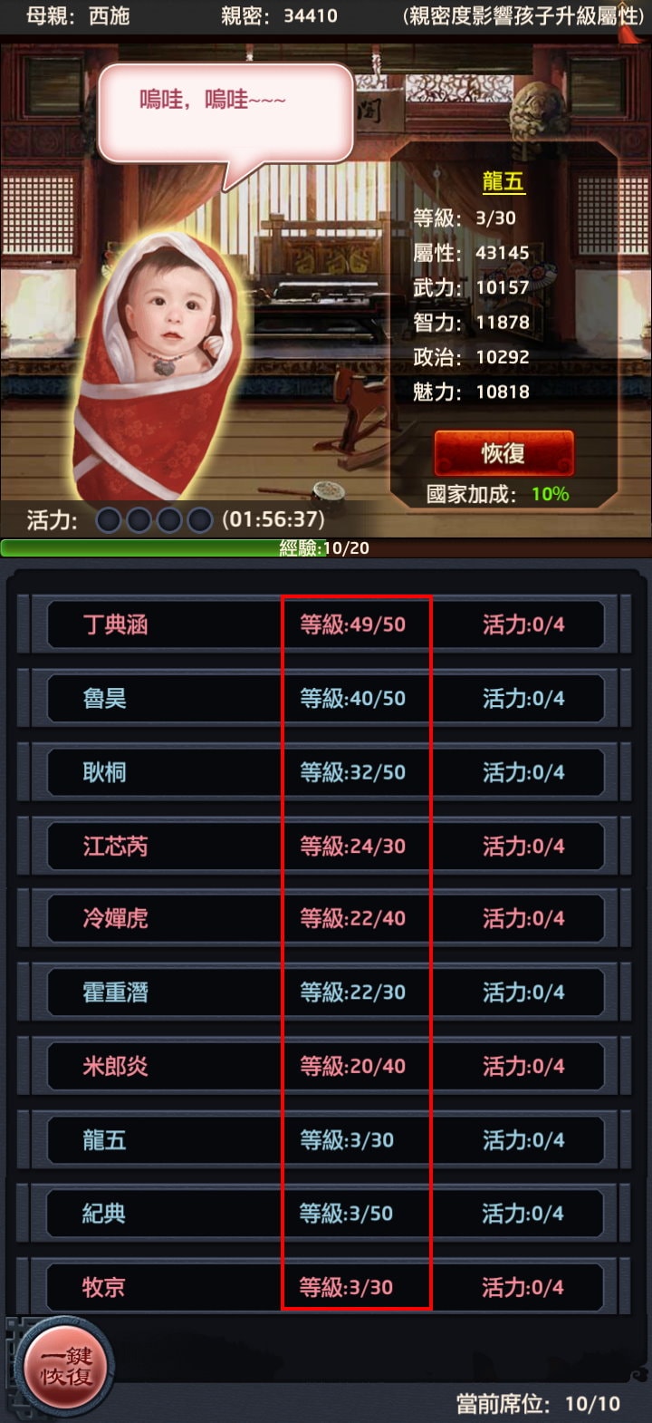 很多玩家玩了一年,書院、子嗣位置都還沒擴充到上限,變成若被幾個低親密的紅顏所生的子嗣佔住子嗣位,能靠子嗣增加的勢力相當少。