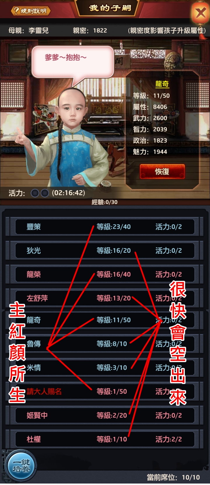 若按照這個玩法,主紅顏以外的其他紅顏所生的子嗣,很快就能養成並科舉,位置也會空出來,其實跟「問候」玩法已經差不多了,相當於主紅顏每生一個子嗣,就省下1,000元寶,也能用來衝榜(平時就正常培養,等勢力榜時才用活力丹)。