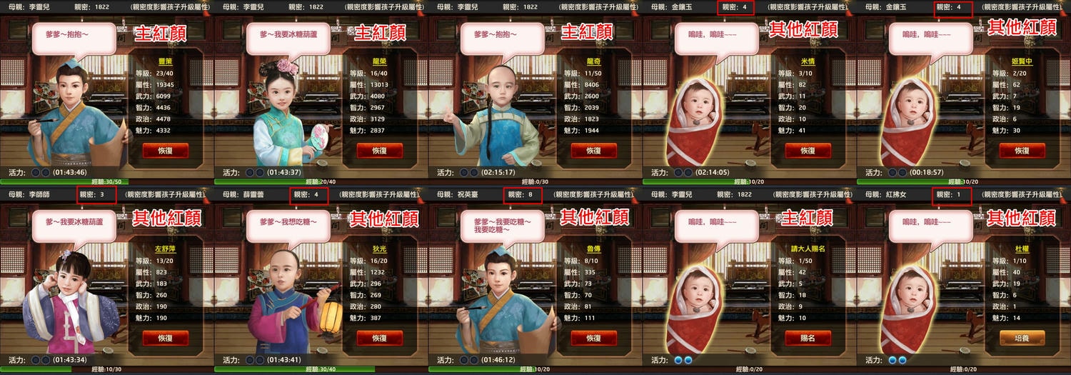 其他紅顏由於親密極低,只會生出笨拙、平庸的子嗣,很好養。圖片中的案例,這號已有14紅顏(看到有李靈兒、李師師、紅拂女應該也能發現吧),但用這方法還是能很頻繁的由主紅顏生出子嗣。