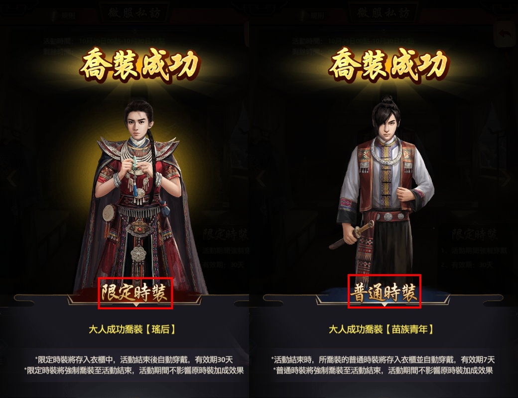《叫我官老爺》「微服私訪」類似「易容坊」,易容坊是取得「頭像」,而微服私訪則是取得「時裝」。