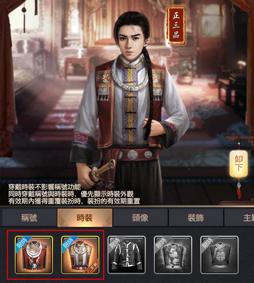 服裝有分「限定時裝」跟「普通時裝」,差異只有在於有限「有效期」,限定時裝是30天、普通時裝是7天。