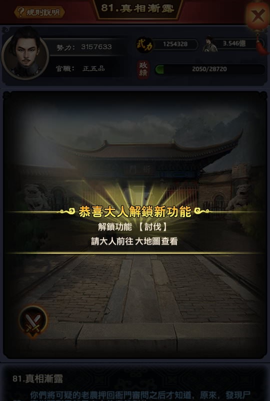 | 系統 | 官品 | 勢力 | 成就 | 道具 | 每日任務 | 主線任務 | 七日福利 | 一鍵功能 | 重歸仕途 | 版本更新 |