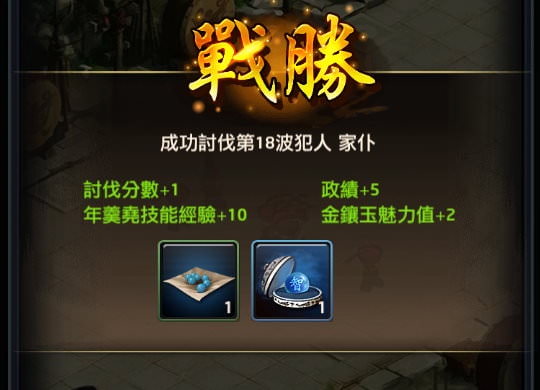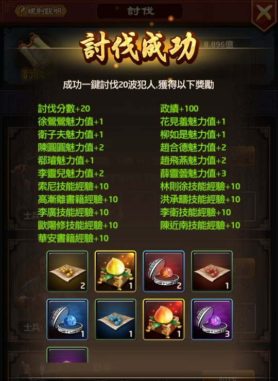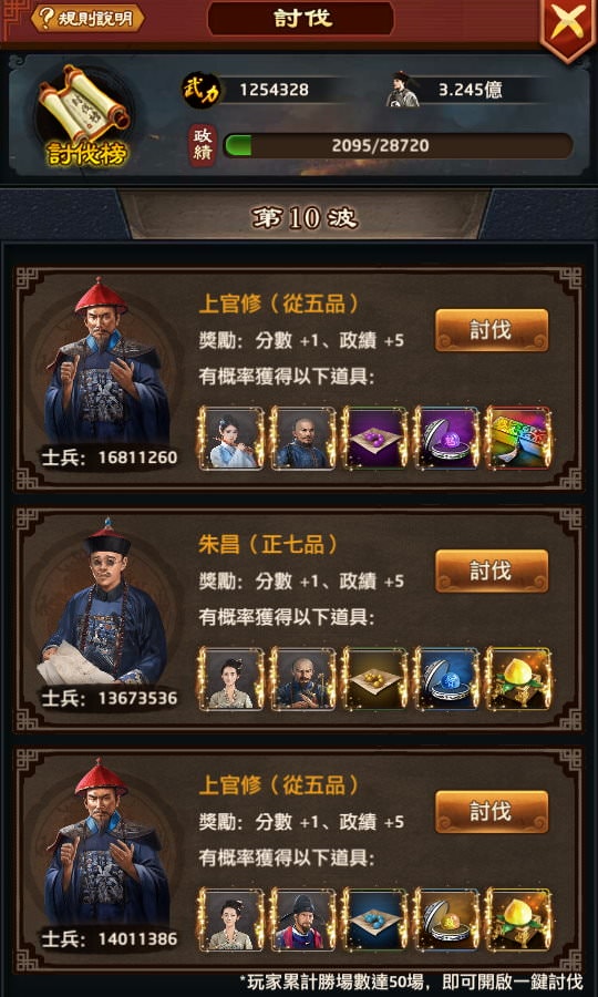 討伐固定的項目是賺政績,1波+5政績,另外還有機率賺到紅顏魅力、門客書籍、門客技能,以及各種道具。若要追求最高CP值,可以等達到這「最低數字」再討伐到該波數,但如果想要比其他相同條件的玩家多賺些政績、丹丸,就可以在「數字不要差太多」的狀況下提前多討伐個十波。