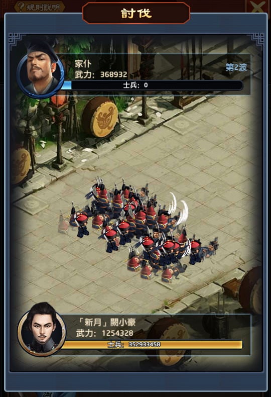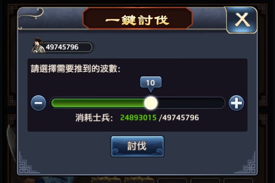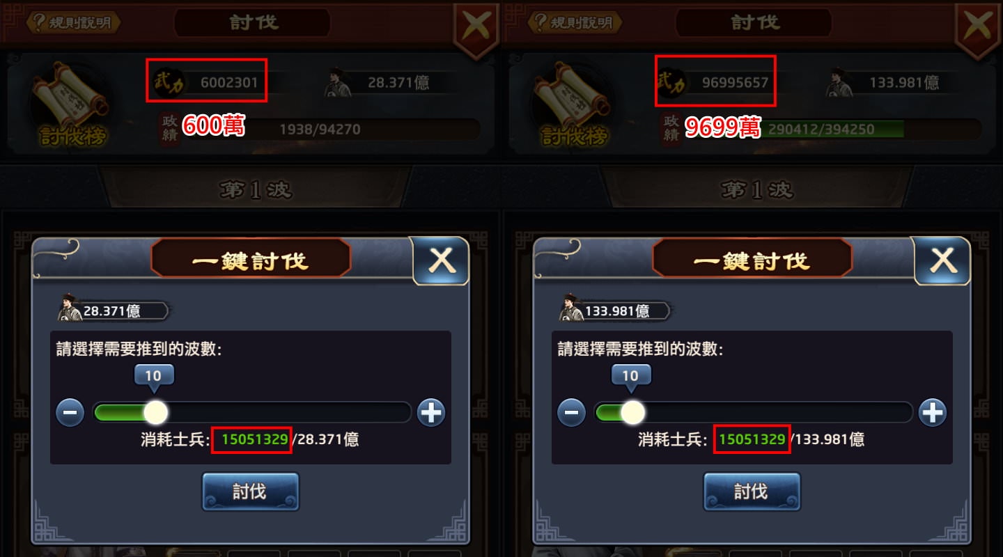 發現:總武力屬性越高,討伐所需要消耗的兵力就越少,但到一定程度後,就無法再減少。像武力600萬跟武力9699萬,討伐10波都需消耗「15051329」的士兵。