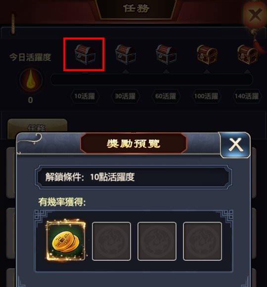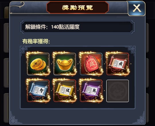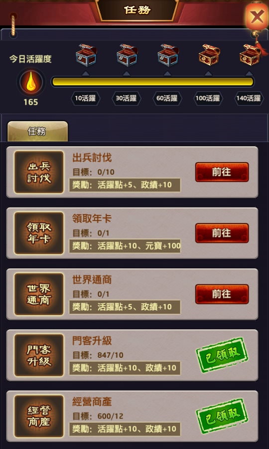 若想開啟第五個寶箱(有元寶*50、強化卷軸),得完成140點活躍度。