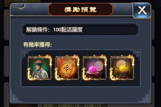 | 推圖過關 | 16 | 活躍度+10、政績+10 |