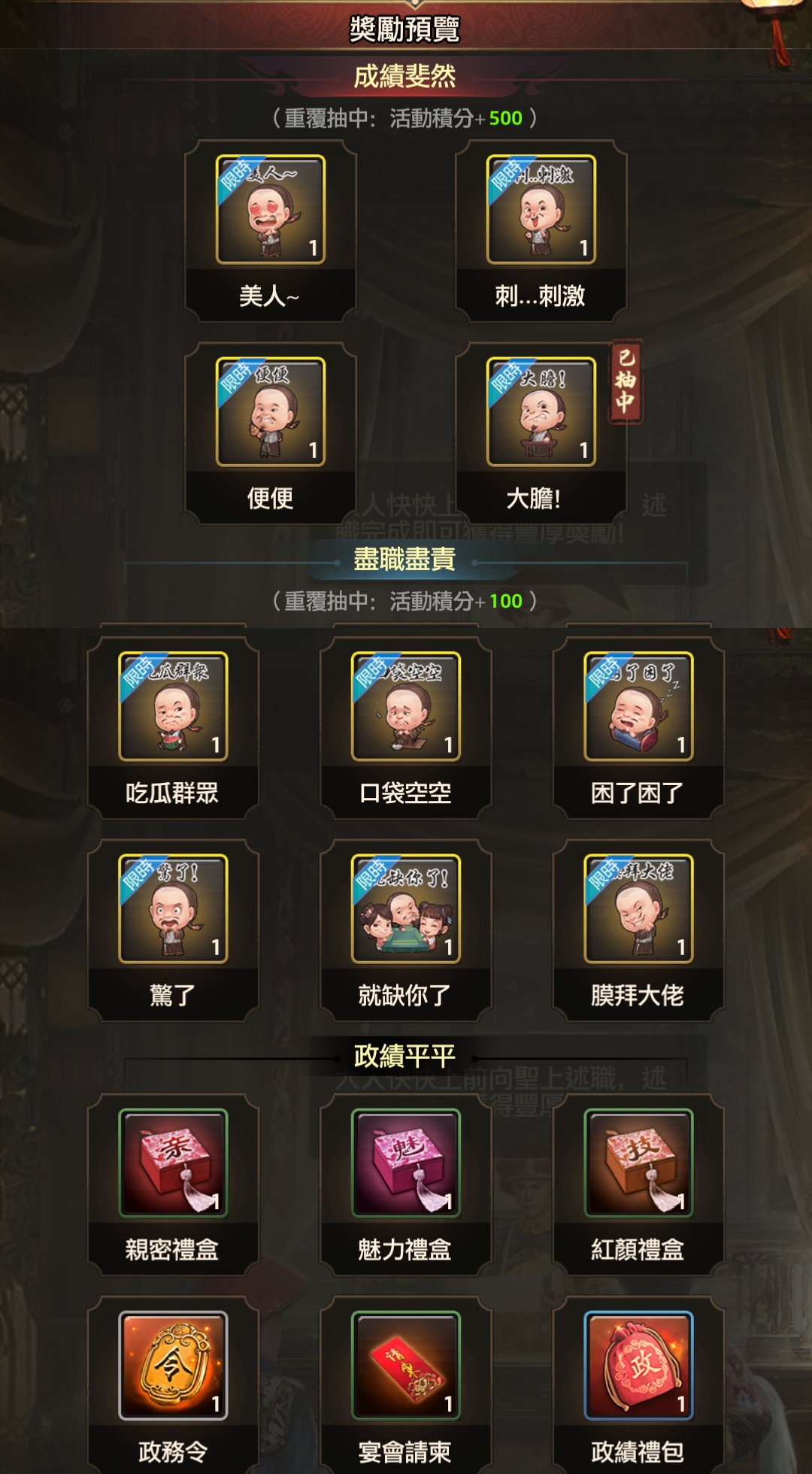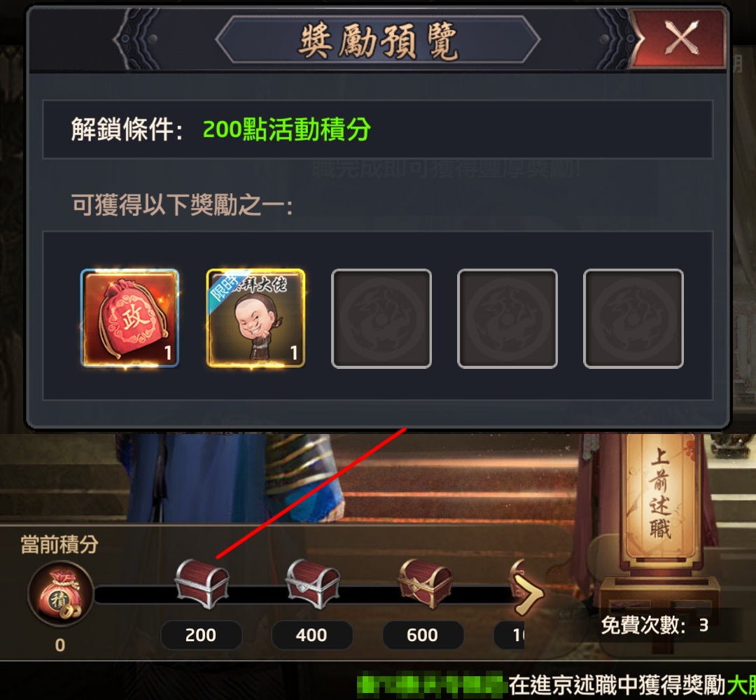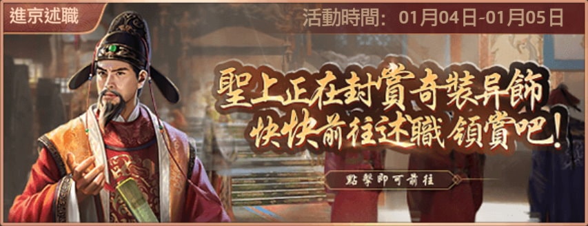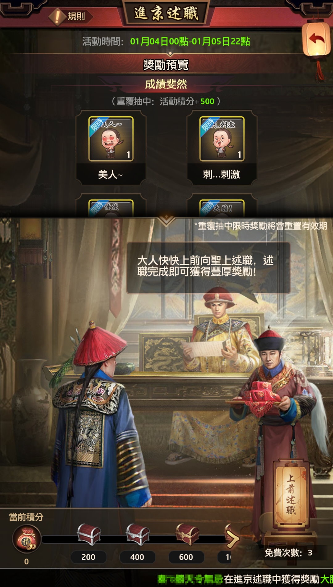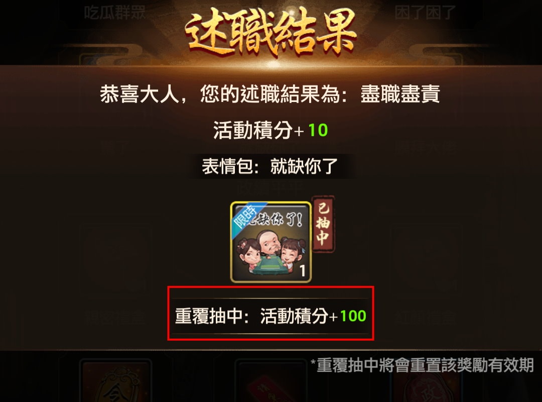 - 活動期間,大人將會被召往宮中進行述職,每次述職完成後,可隨機抽取獎勵和獲得積分獎勵。