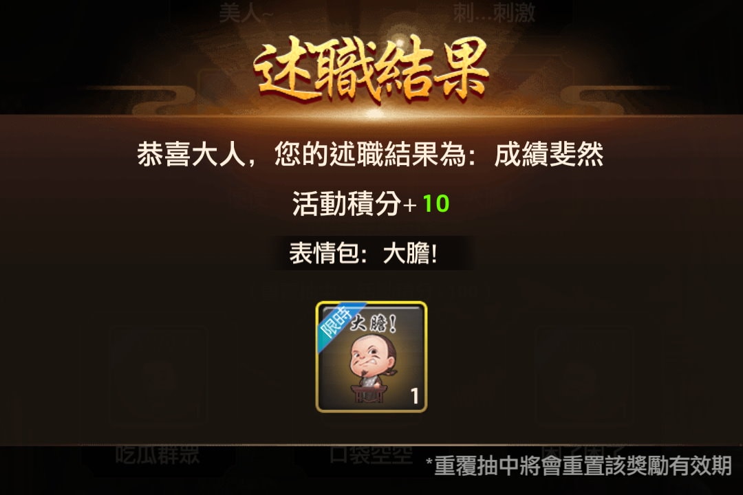 若要額外述職(抽獎),則須儲值購買含有道具「丙級奏章」的禮包。