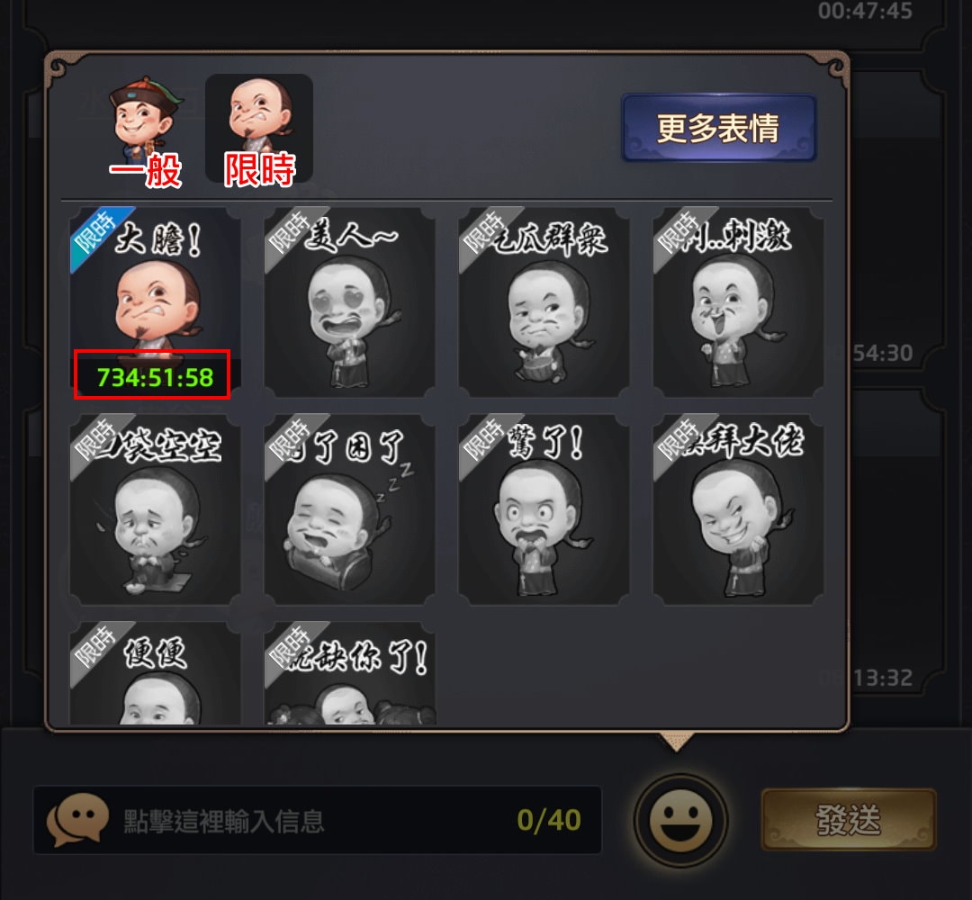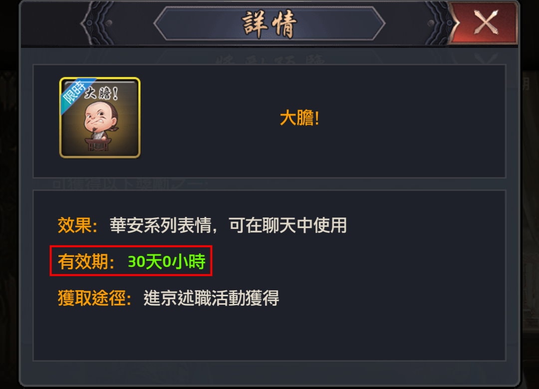 表情包或府邸裝扮都有使用期限,通常是30天。