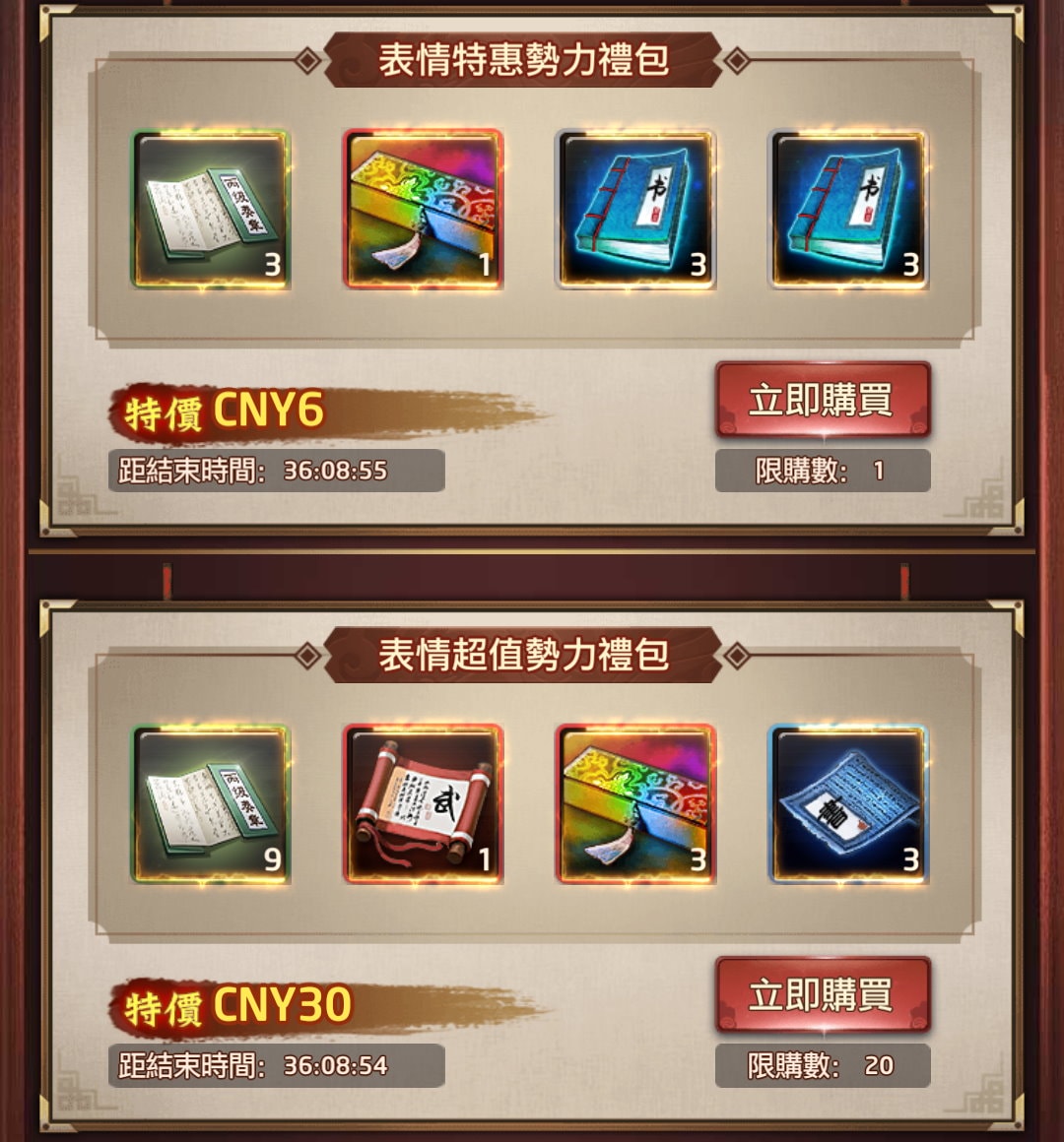 | 丙級奏章*3 | 表情特惠勢力禮包 | 6人民幣,限購1 |