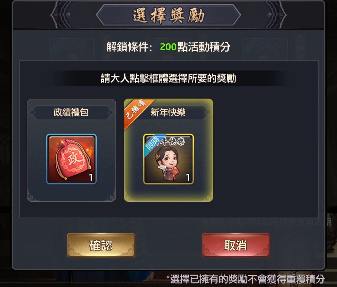 - 限時獎勵可以被重複抽中,重複抽中將重置該獎勵的有效期並獲得額外的積分。