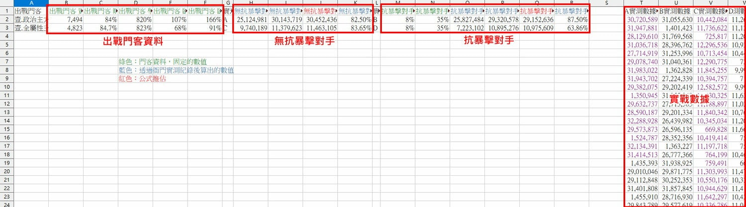 其他欄位,綠色部分是門客相關資料、藍色是從實戰數據統計出來的各種資料、紅色是用我的公式下去推出。