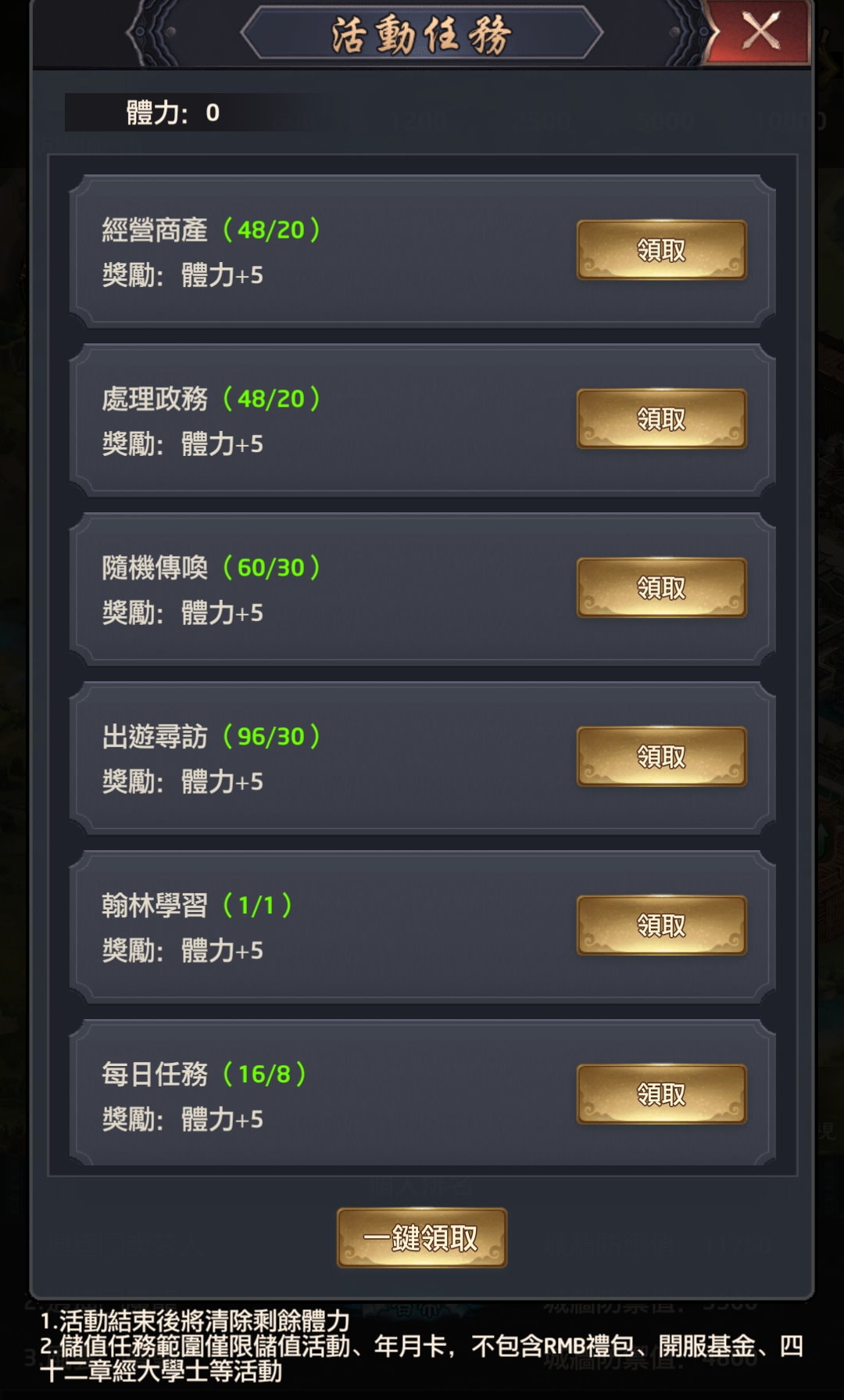 - 活動結束後將清除剩餘體力。