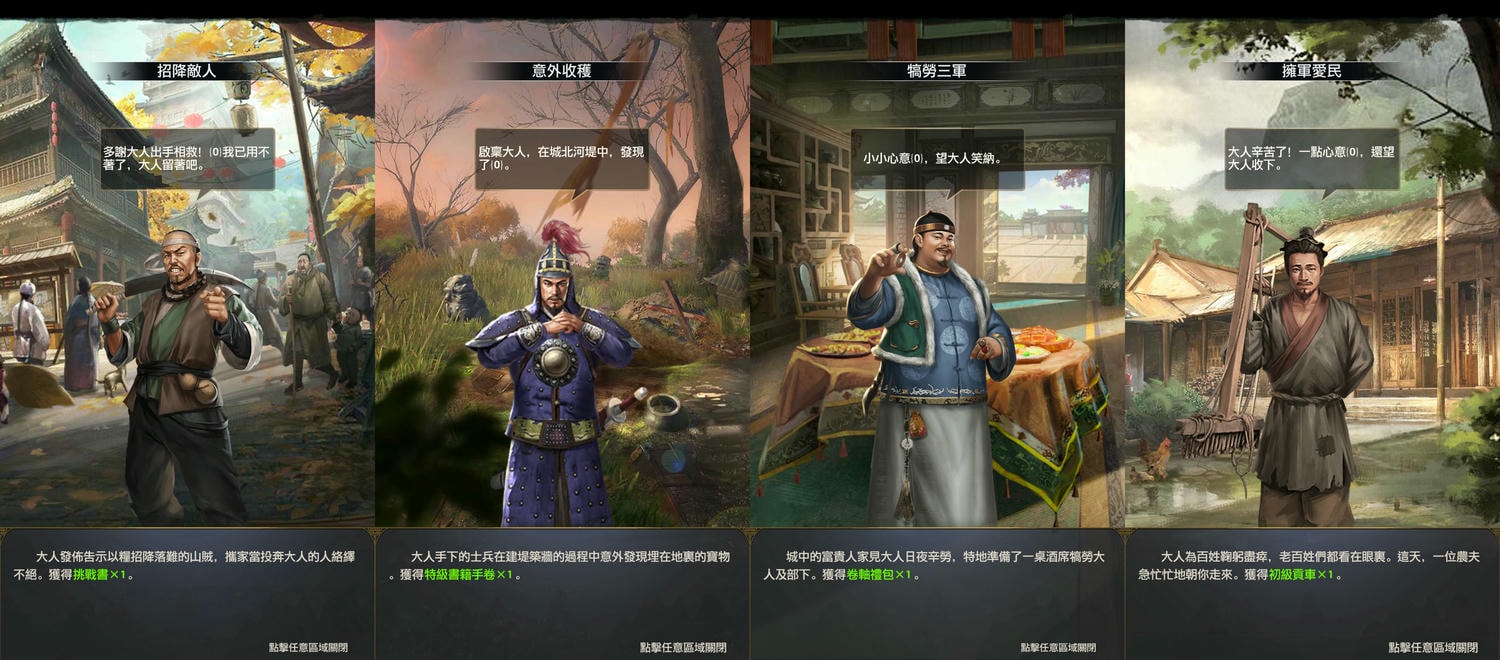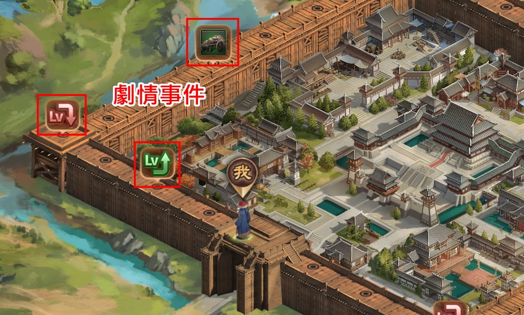城牆上初始有3個劇情事件,每180分鐘增加1個,上限值為5個。劇情事件大致上有三類: