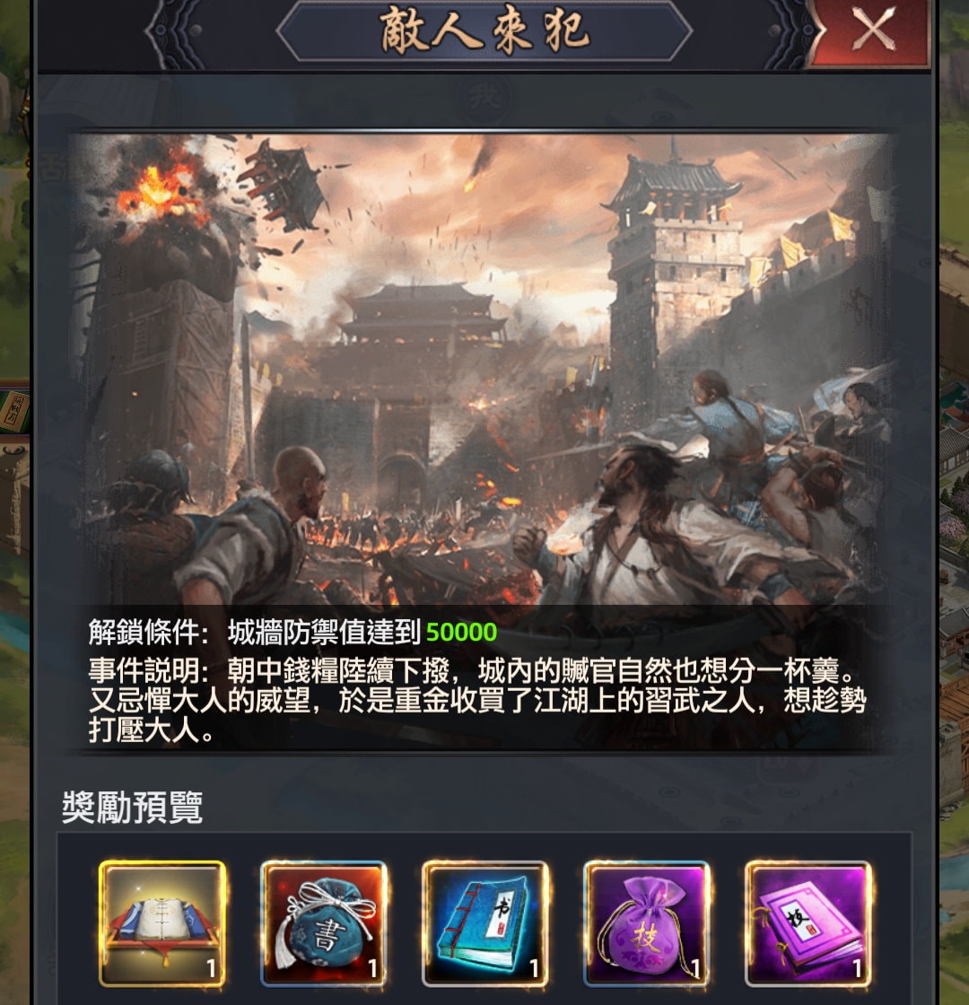 當城池的防禦值達某個分數後,就會觸發「敵人來犯」,這個就是成就獎勵。