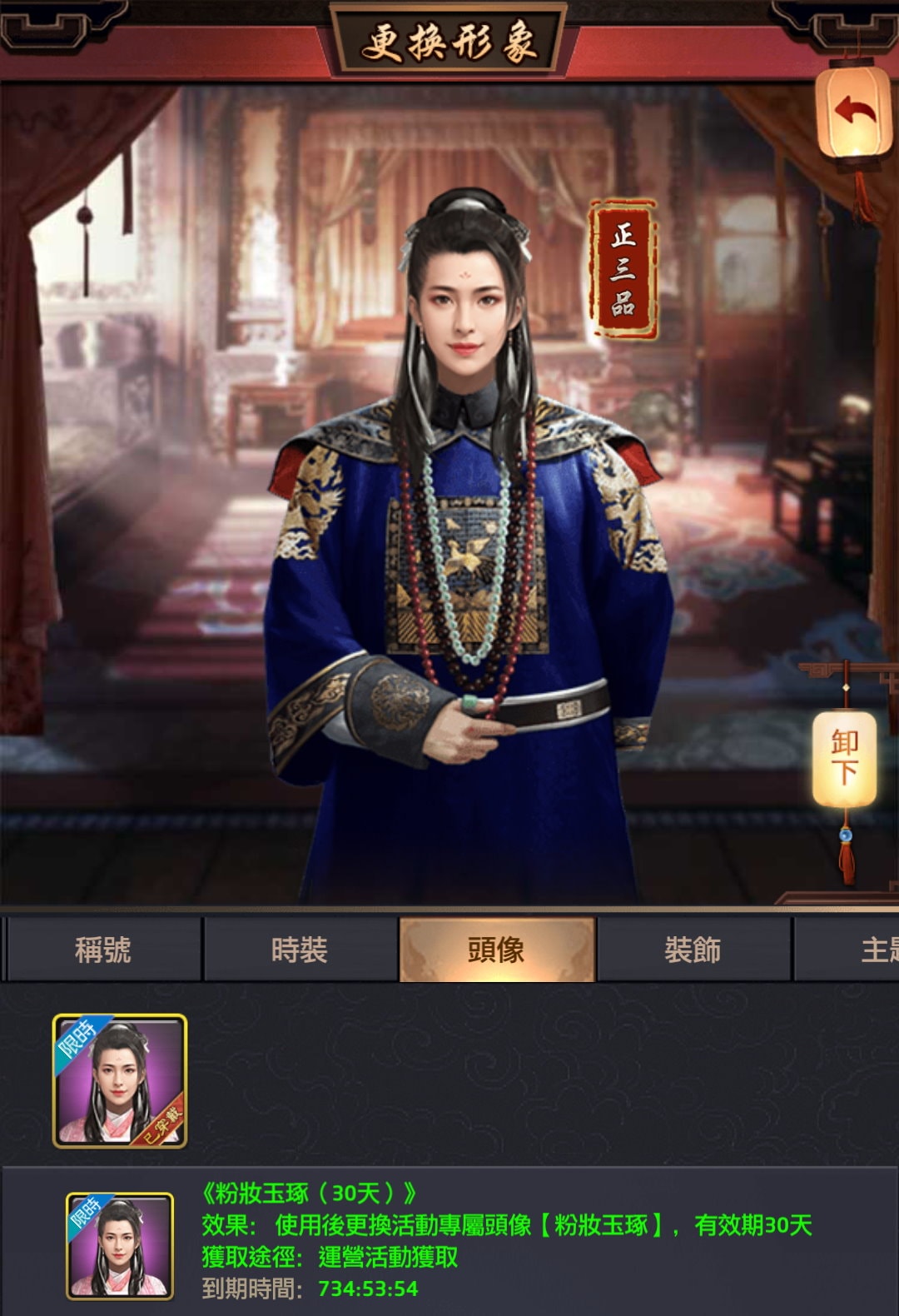 若抽到限定頭像,可以點自己大頭照 > 換裝 > 頭像來使用,一般這類頭像(或帝王公卿服裝)都一樣,獲得後不管你有沒有替換,就開始倒數30天,30天內可隨時穿上脫下。