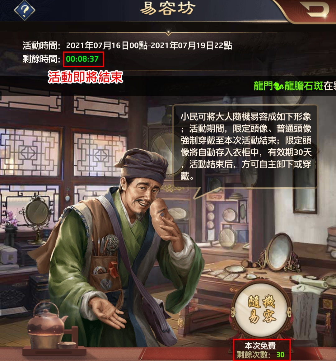 易容坊無法選擇你要的頭像,只能靠「隨機易容」取得,又分成「普通頭像」或「限定頭像」兩類。有3次免費機會,額外抽要消耗「易容祕笈」。易容祕笈得在商城儲值購買。