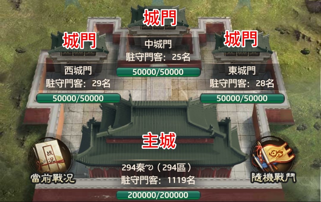 對戰時,得先把三個城門其中一個擊破(血量歸0),才能攻擊主城。(與八旗勤王概念類似)