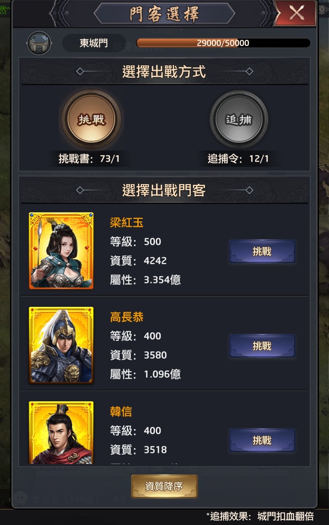 如果想指定某個城門攻擊,可點擊該城門後,再看要「挑戰」(消耗挑戰書)或「追捕」(消耗追捕令,城門扣血翻倍)。
