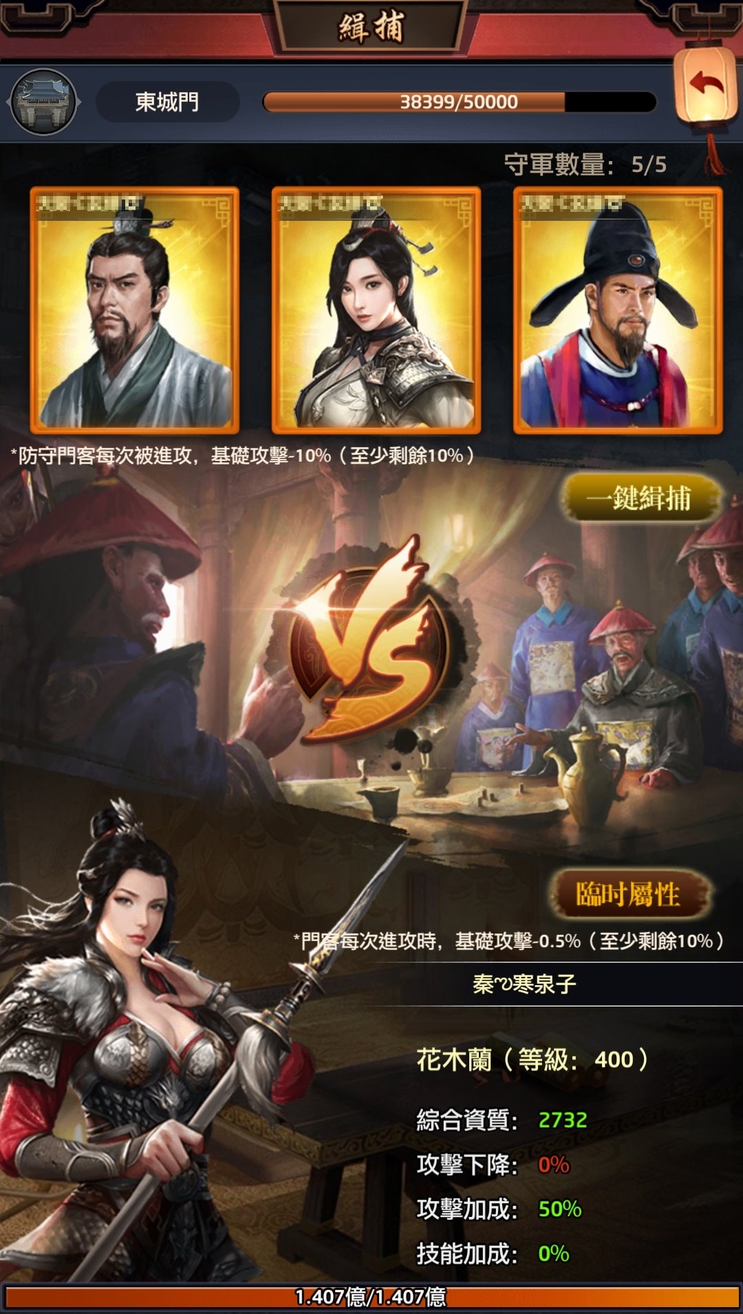 - 大人進攻時,將從駐守在該城門/主城的所有敵方門客中進行三選一的衙門戰鬥(敵方城池的駐守門客數實時更新)
