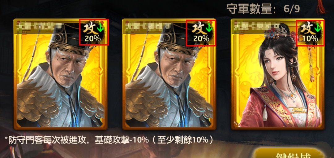 (2) 防守門客每次被進攻,基礎攻擊-10%,至少剩餘10%
